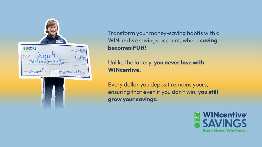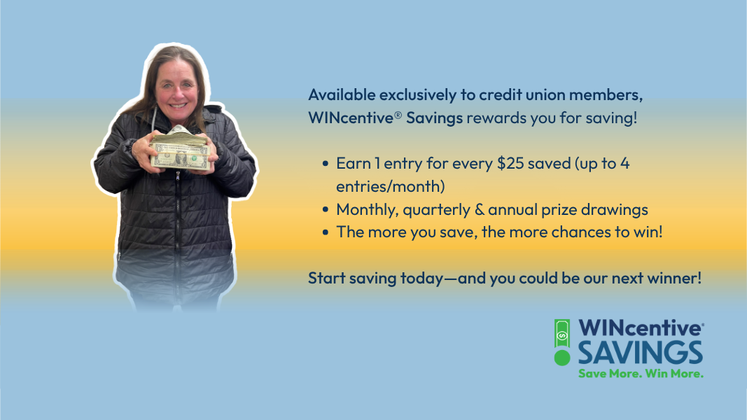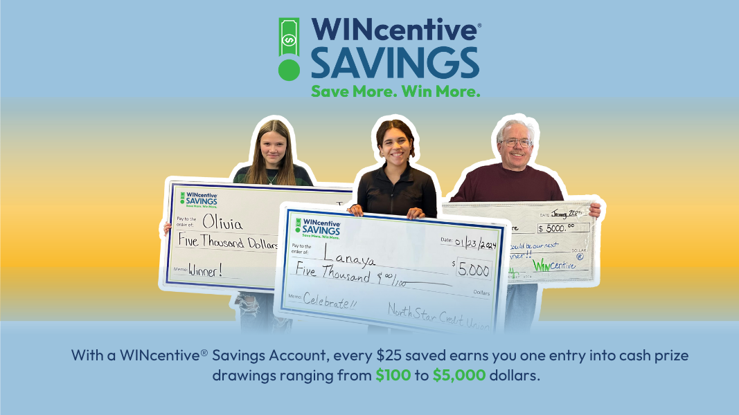 Available exclusively to credit union members, WINcentive® Savings in Minnesota offers prize drawing entries for every $25 you save (up to 4 entries per month)*. Prize drawings occur monthly, quarterly and annually – so the more you save, the more chances to win!