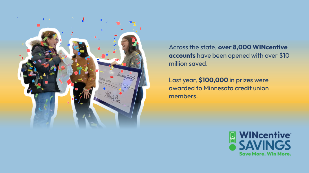 Since 2016, 8,700 WINcentive savings accounts have been opened with nearly $13 million saved. Minnesota credit union members totaling $100,000 in prizes were awarded in 2023 to Minnesota credit union members.